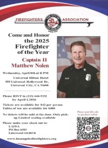 It is our honor to announce and congratulate our 2025 Firefighter of the Year, Captain II Matthew Nolen, a firefighter whose life, service, and character reflect the highest ideals of the Los Angeles City Fire Department (LAFD).